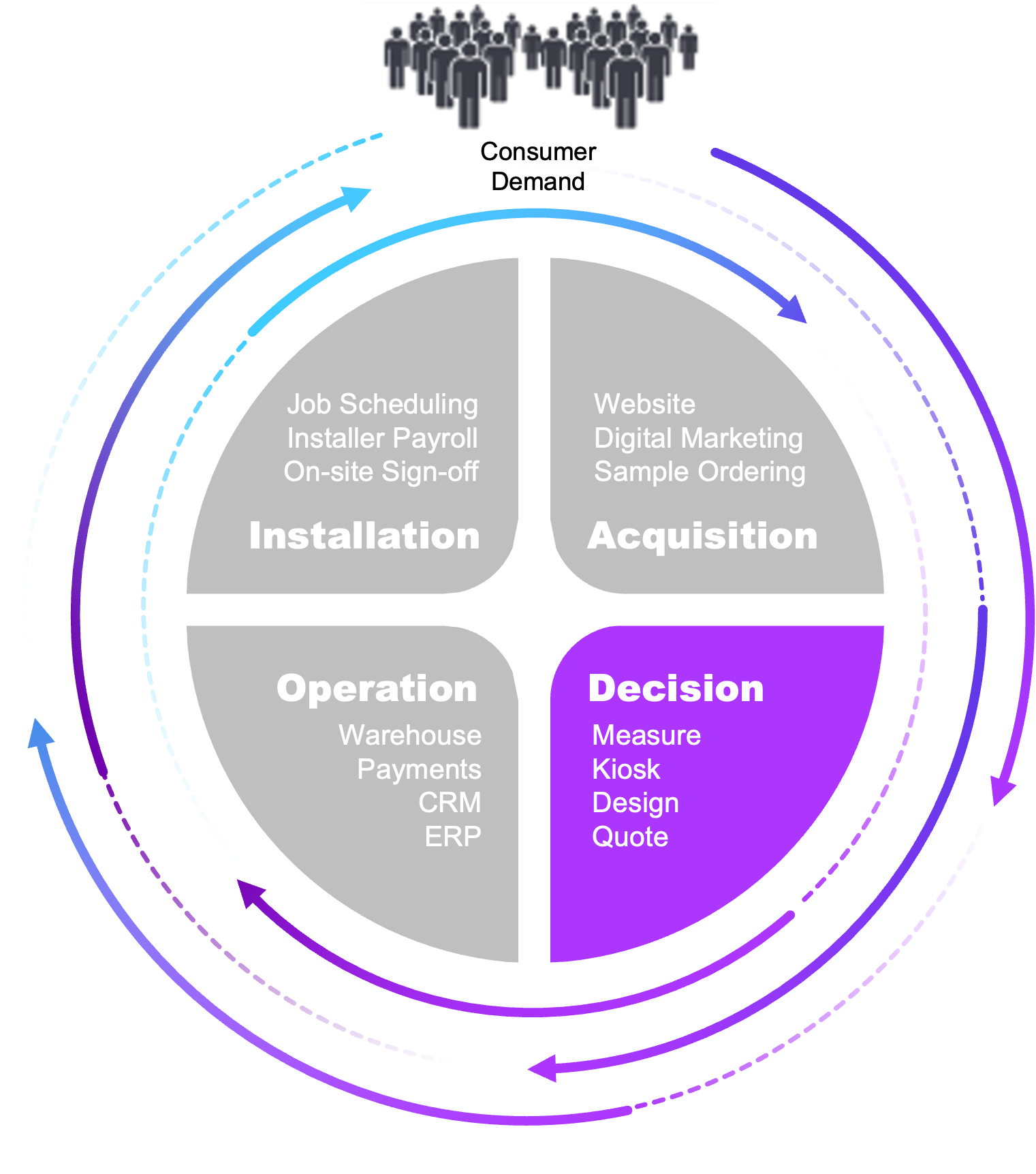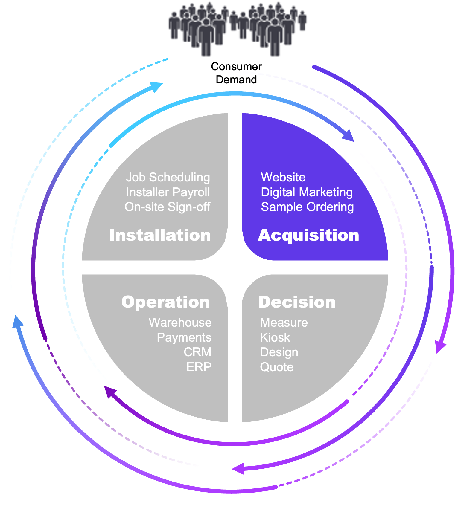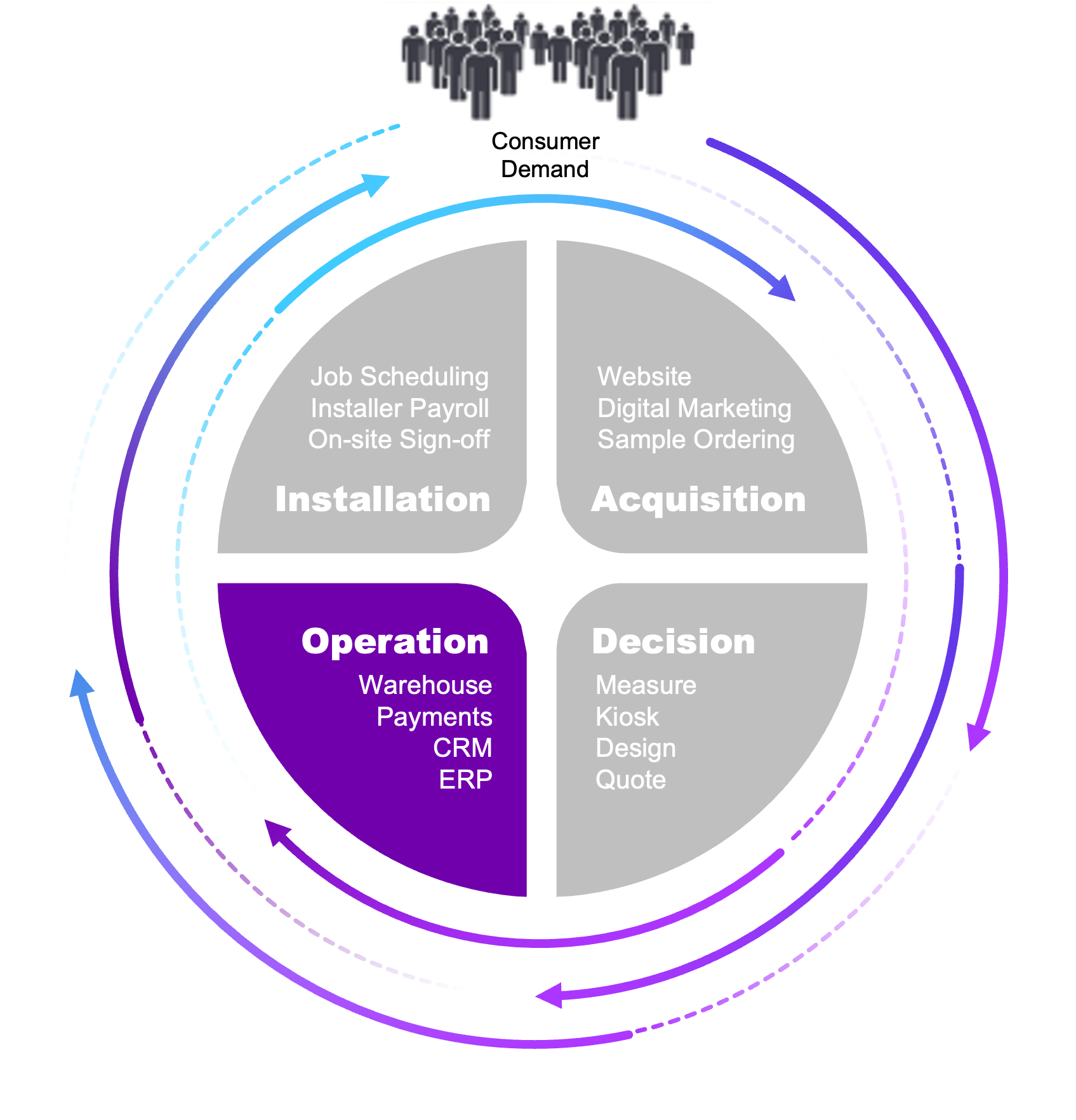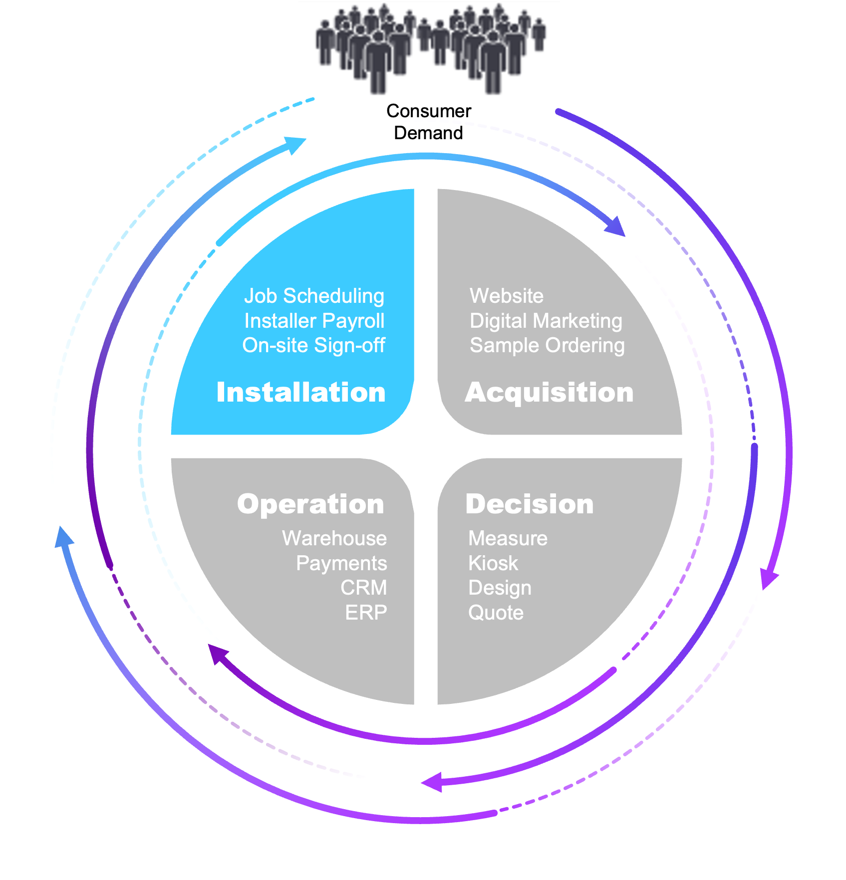 Operations: CRM, ERP, warehouse management, and payments connected so nothing falls through the cracks between the sale and the install.
